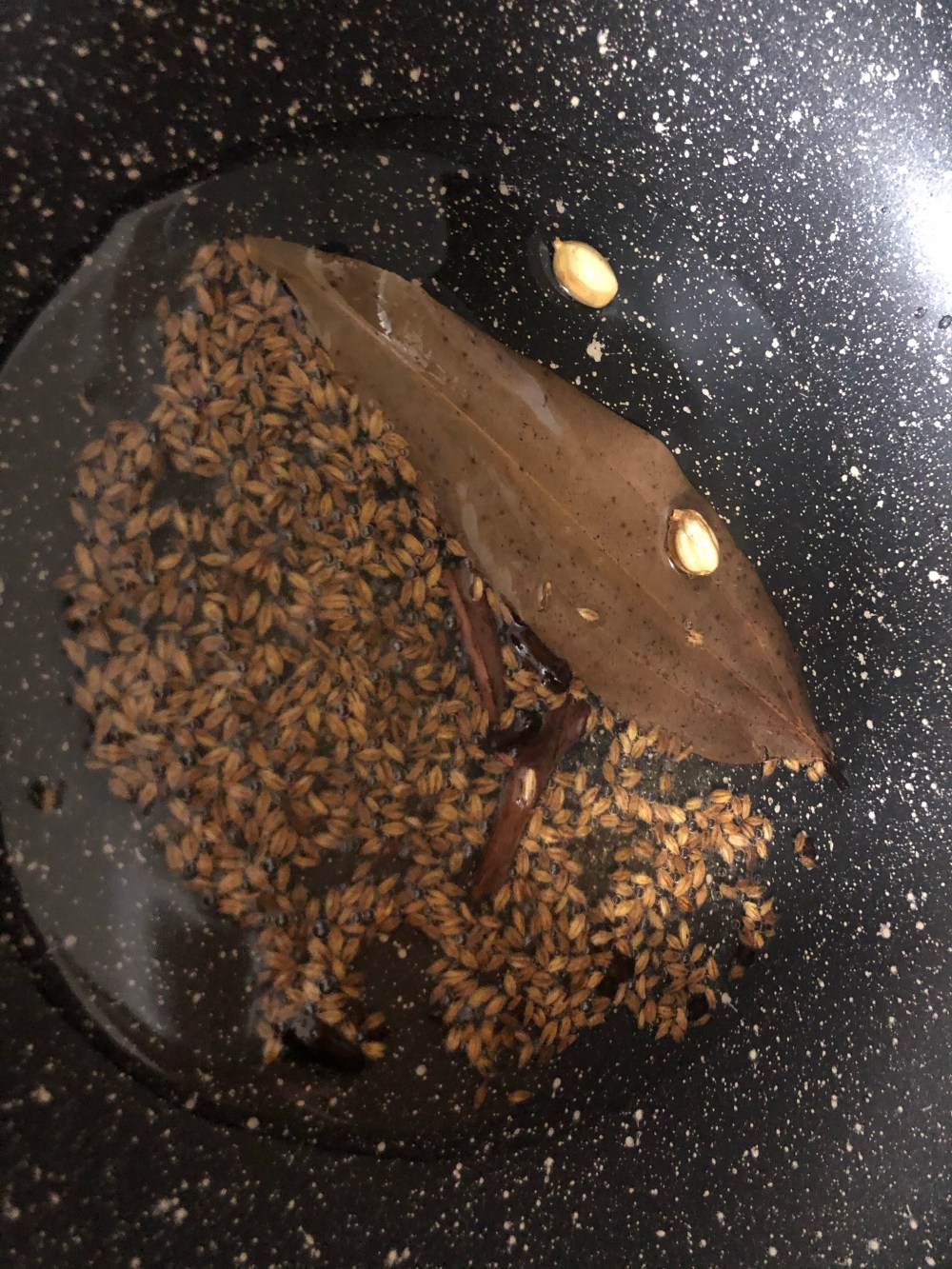 - Add all the dry spices – bay leaves, cinnamon, cloves, cardamom and fry until they turn aromatic.