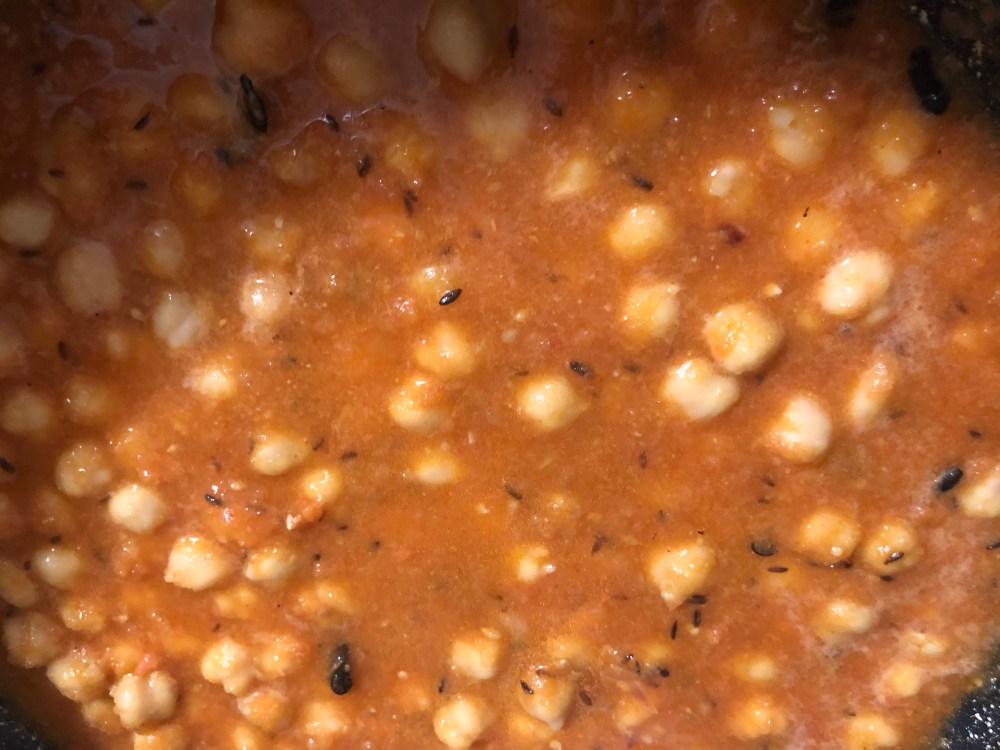 - Add canned chickpea into the cooking pot and combine it with the onion-tomato gravy.