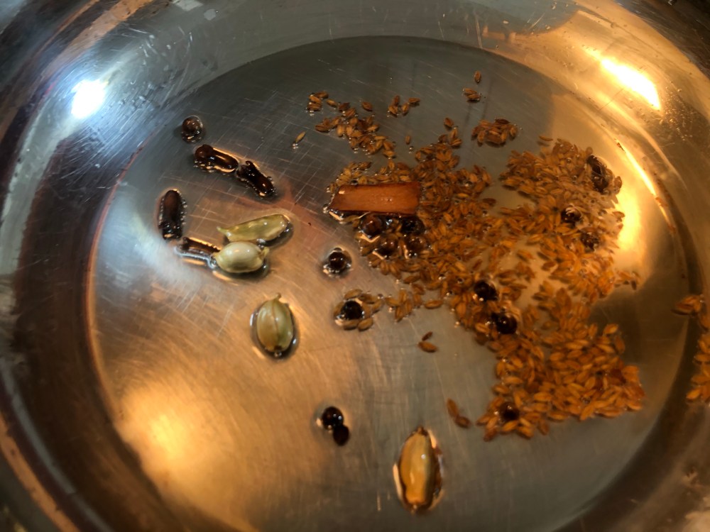 - Once the oil is hot, add all the whole spices – cloves, cardamom, cinnamon, cumin seeds, black peppercorns and fry them 30 seconds or until they turn aromatic.