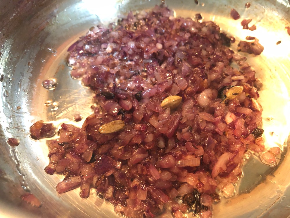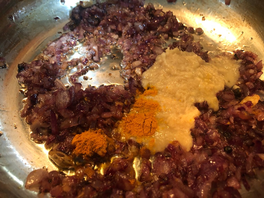 - When the onions begin to turn brown, add 1.5 tsp of ginger-garlic paste and 1/2 tsp turmeric powder.