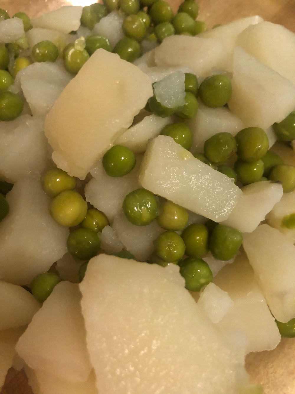 - Into a pressure cooker, add potatoes, green peas, salt, and water, and pressure cook until vegetables are done. (You could use a regular saucepan to cook as well.)