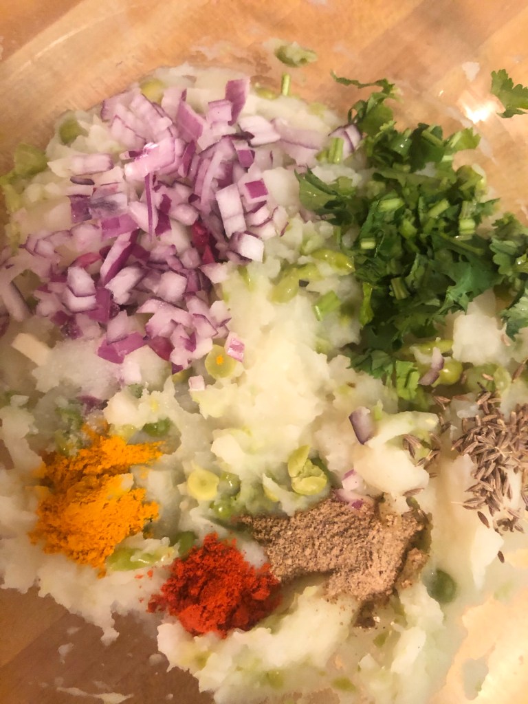 - Into a large mixing bowl, transfer mashed vegetables, add onions, cilantro, turmeric powder, red chili powder, chaat masala powder, cumin seeds, lime juice, and salt to taste. Mix well.
