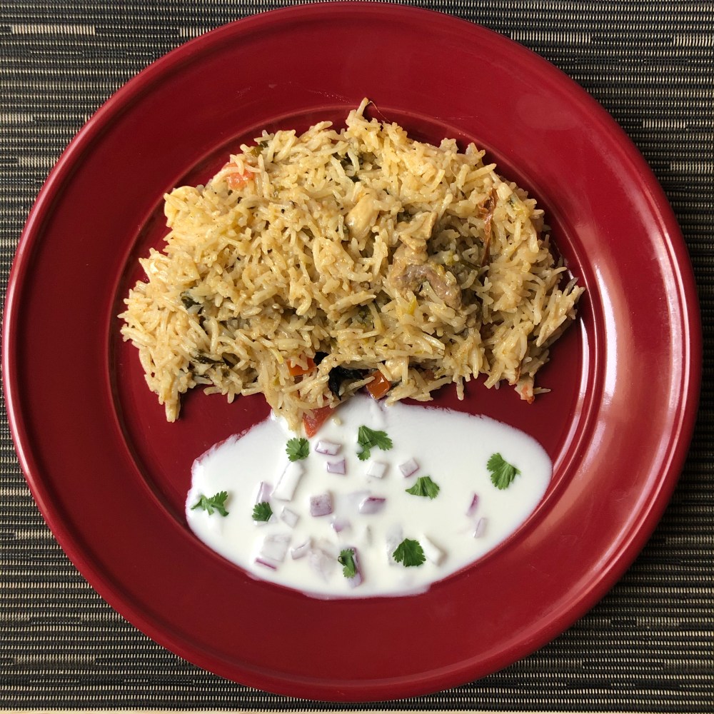 - Enjoy delicious mutton biryani with onion raita.