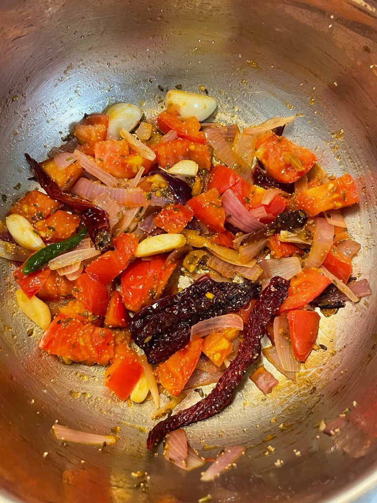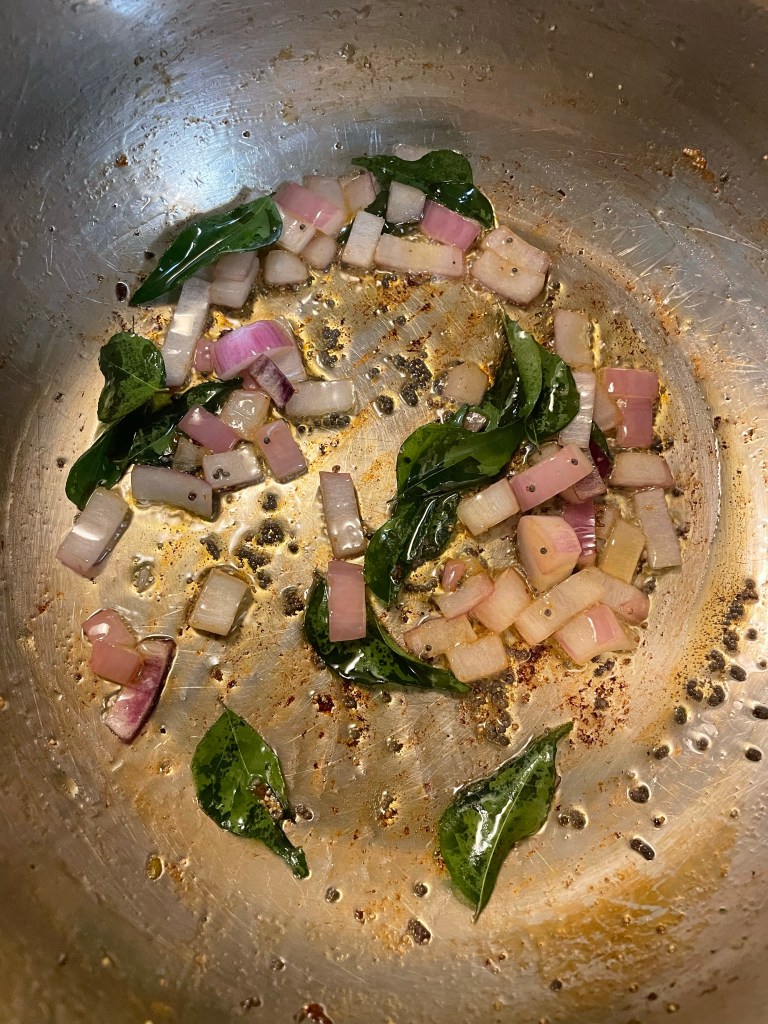 - Add mustard seeds, once it pops, add curry leaves, chopped onion and sauté until onion translucent.