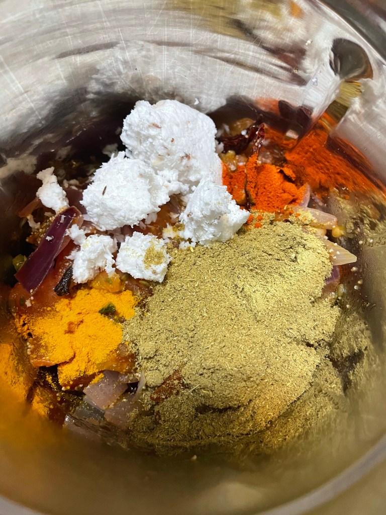 - For preparing the masala paste: Heat cooking oil in a pan on medium heat. Add and sauté dried red chilies, cloves, cinnamon, fennel seeds, poppy seeds for 20 seconds. Then add ginger, garlic, onions, and sauté until onion translucent. Lastly, add tomatoes and sauté until they are soft. Turn off heat and allow these ingredients to cool. Transfer the cooled ingredients into a mixer. Into that, add grated coconut, coriander powder, turmeric powder, red chili powder, salt to taste and pour little water and blend the ingredients into a fine masala paste.