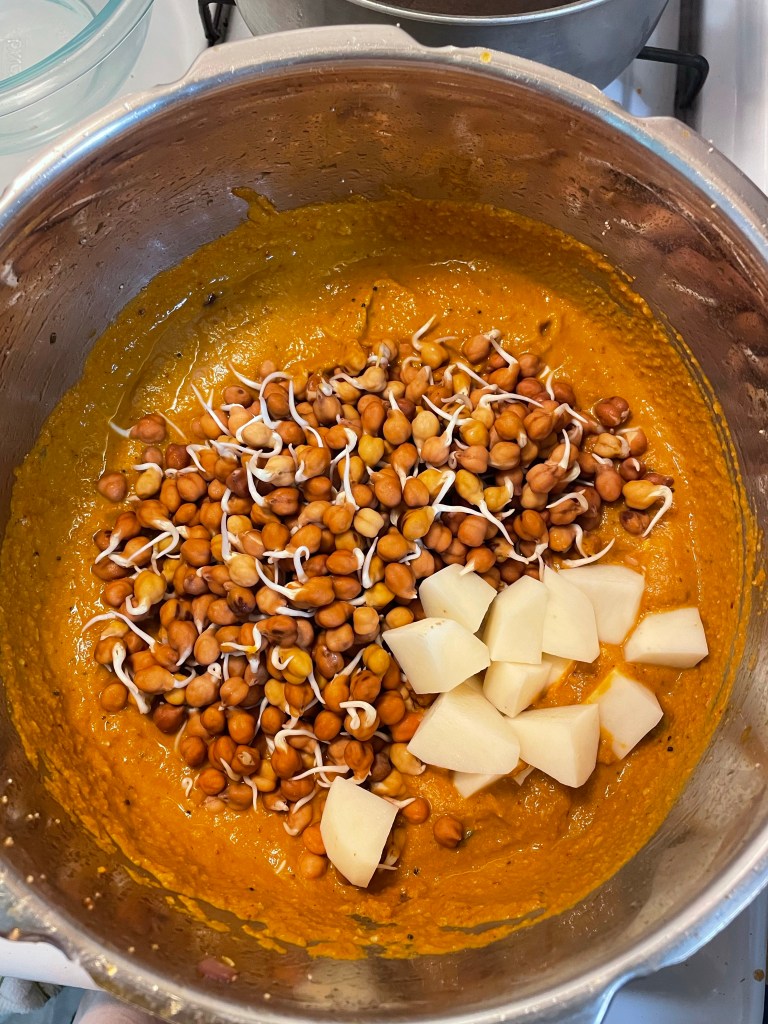 - Then add the sprouted black chickpeas, diced potatoes, and cook them for a minute or two.