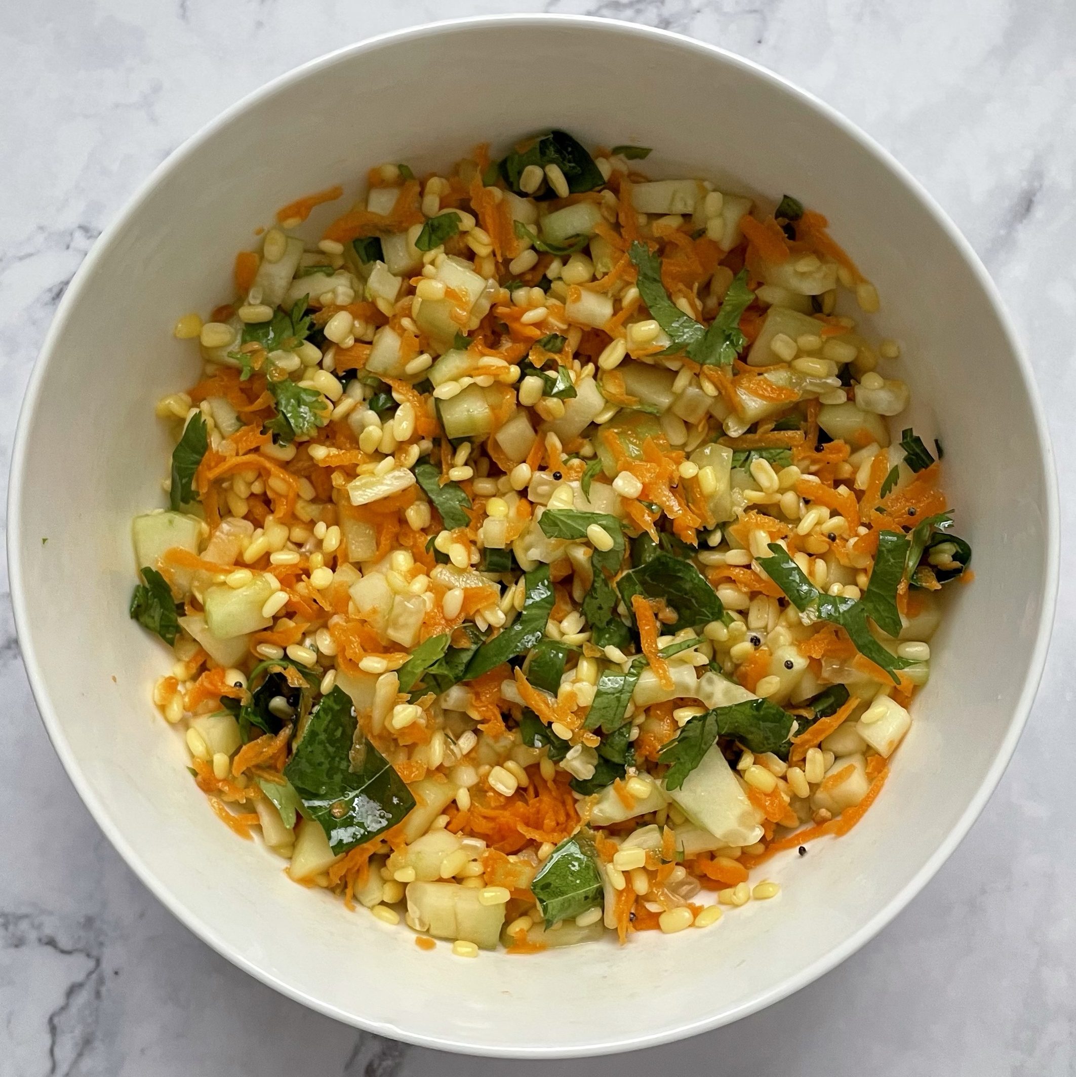 Add soaked and drained split mung, cucumber, carrot, cilantro, and salt to taste into a mixing bowl and combine well.