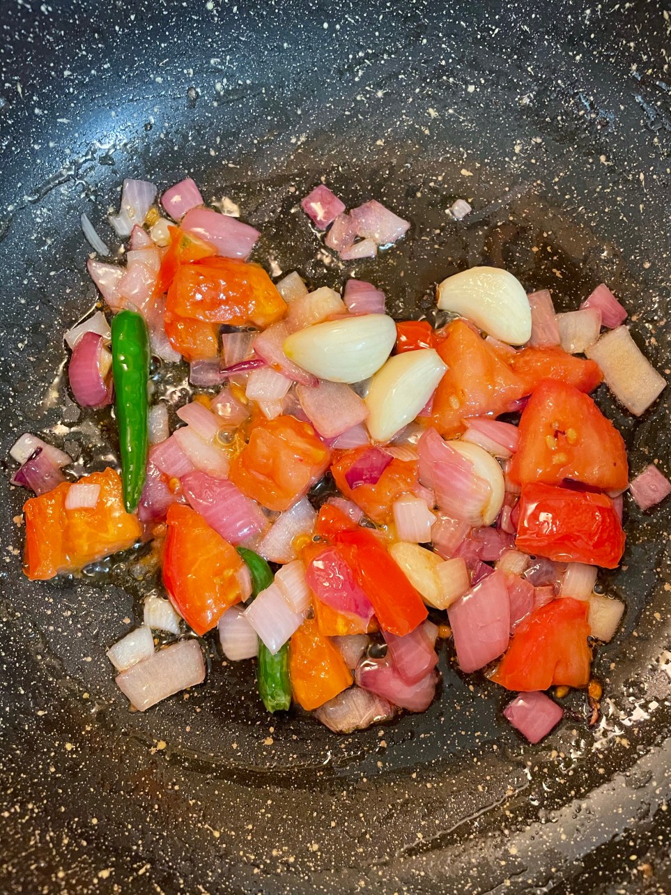 - Into the same pan, add two tablespoons of oil and heat it on medium flame. Add and sauté green chilies, onion, garlic, and tomato for 2-3 minutes and turn off the heat. Allow these ingredients to cool.