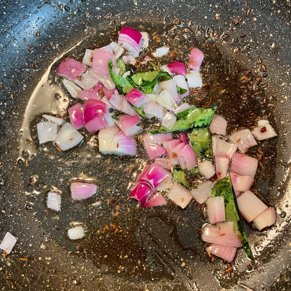 - Heat 3-4 tablespoons of cooking oil in a cooking pot. Once the oil is hot, add mustard seeds, cumin seeds and allow them to pop and sizzle. Then add onion and a handful of curry leaves and sauté for a minute on low heat.