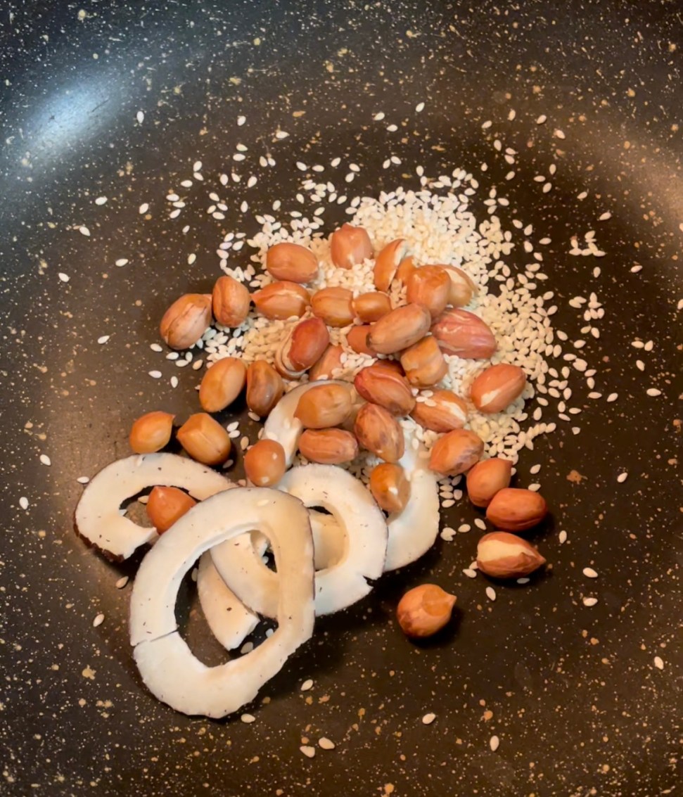 - While the brinjals sit in water, heat a pan on medium heat and dry roast groundnuts, white sesame seeds, and dry coconut for 2 minutes or until they turn light brown. Then transfer them onto a plate and allow them to cool.