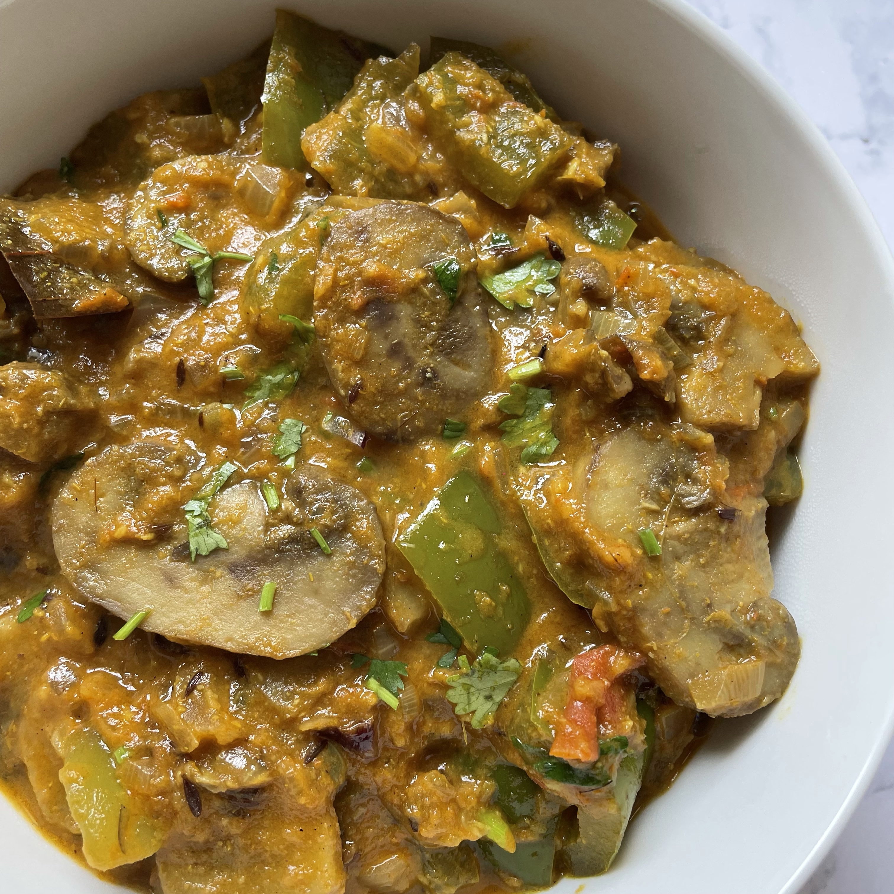 The recipe is straightforward. Simply, sauté dry whole spices in oil along with chopped onion, green chili, ginger-garlic paste, tomato paste, salt, and powdered spices until a thick gravy is an achieved. Then add & cook mushroom and capsicum until done, and garnish with cilantro!