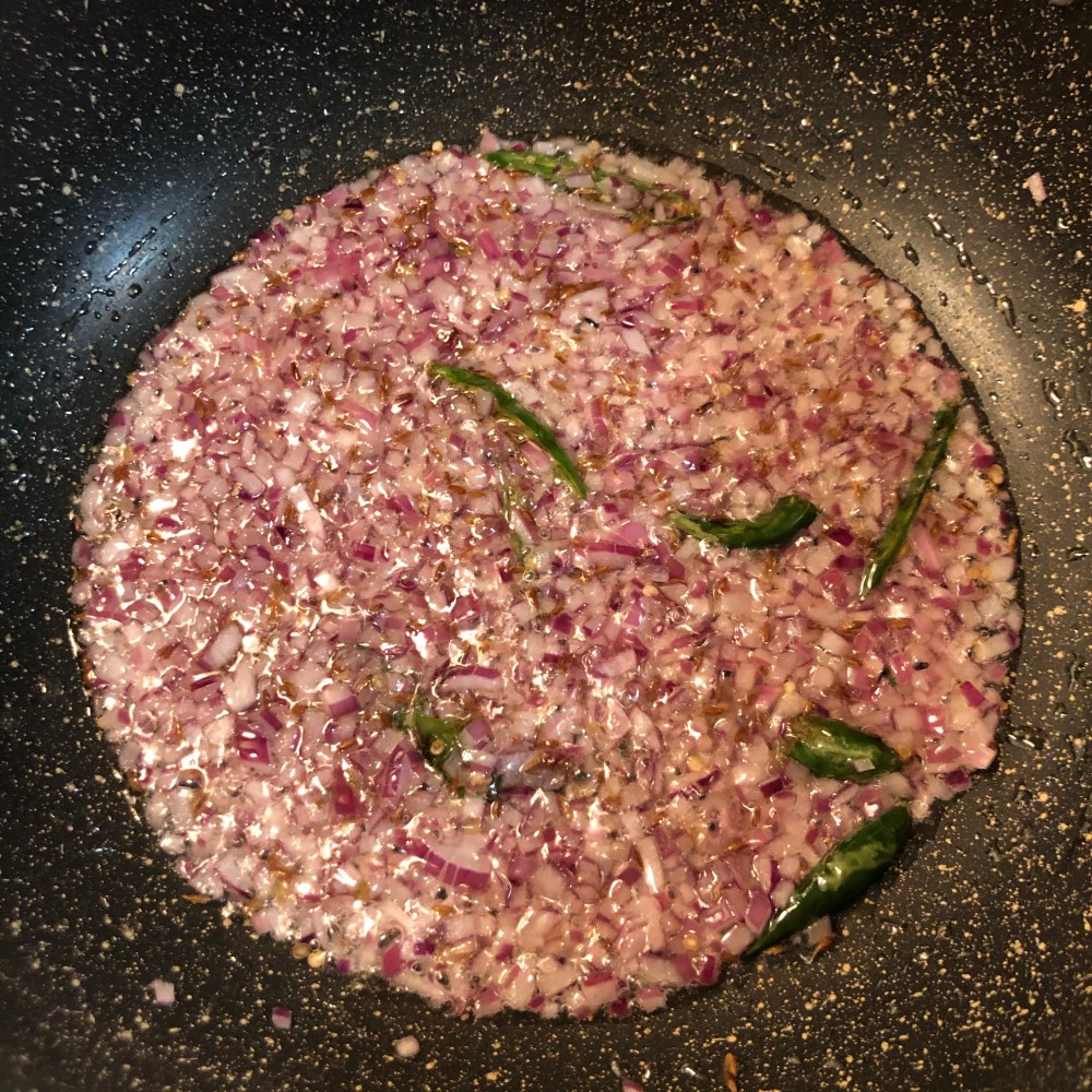 - Add green chilies, curry leaves, onion, and sauté on medium heat until onion light browned.