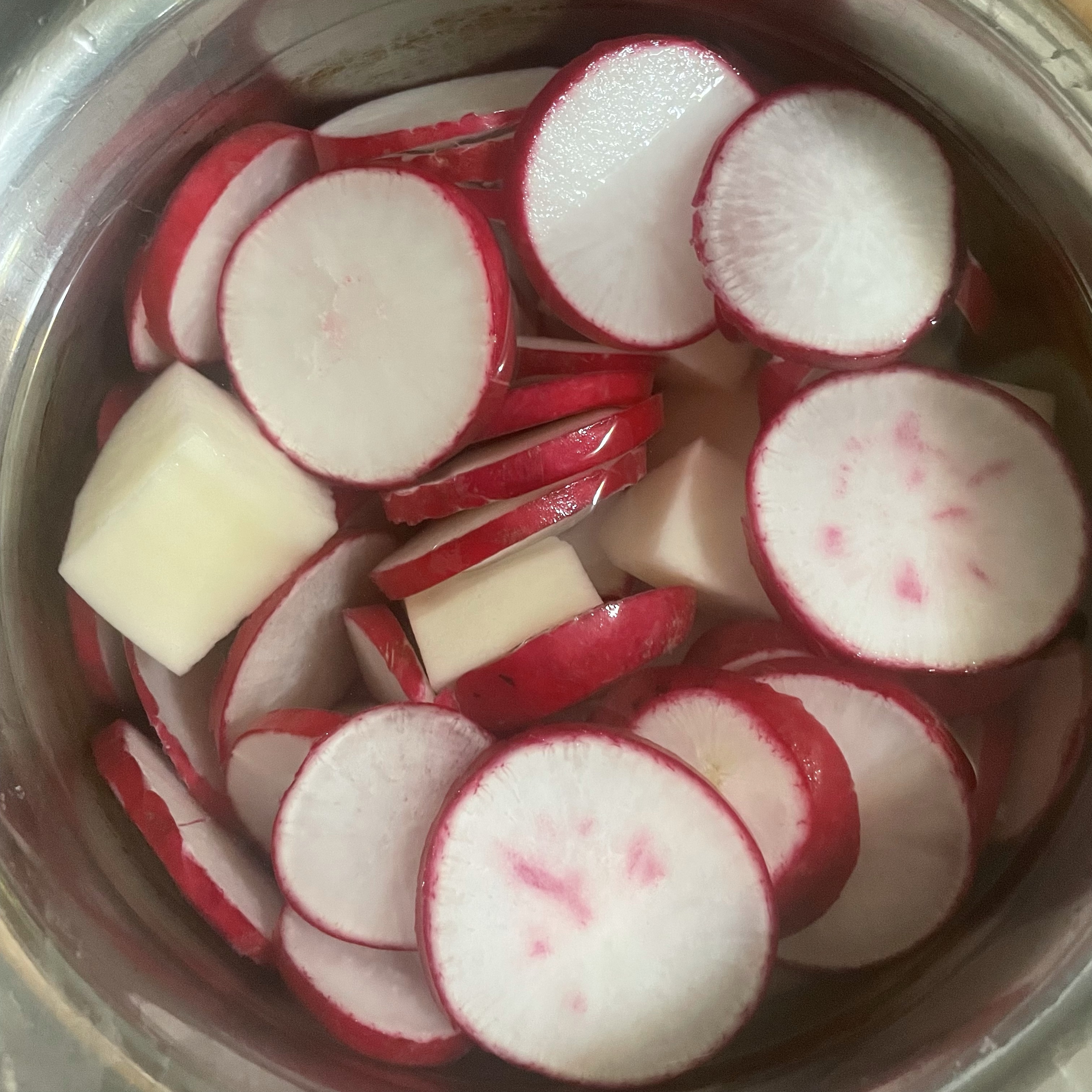 This recipe is straightforward. Unlike the white radishes, you could use these salad radishes directly without peeling their skin. And I like including potatoes too as it adds to the taste. But you could give it a pass and use only radish.